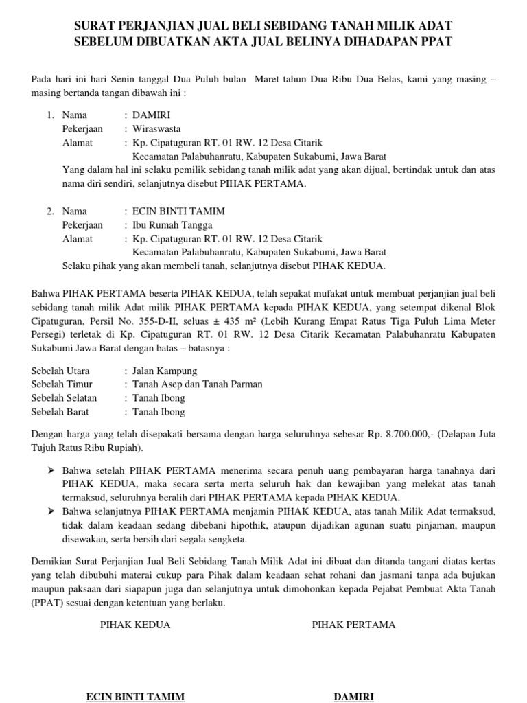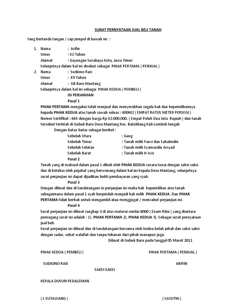 Dalam surat ini akan tertulis identitas pihak yang bertindak sebagai penjual tanah dan juga identitas dari si pembeli tanah. Contoh surat pernyataan jual beli tanah dan rumah. Pemilik tanah memang tidak selamanya merupakan orang yang tertera pada sertifikat tanah tersebut. Sukoharjo, 12 agustus 1996 pekerjaan surat perjanjian jual beli tanah. Bisa dijadikan bukti, tanda jadi, dan berbagai macam bentuk keperluan lainnya.