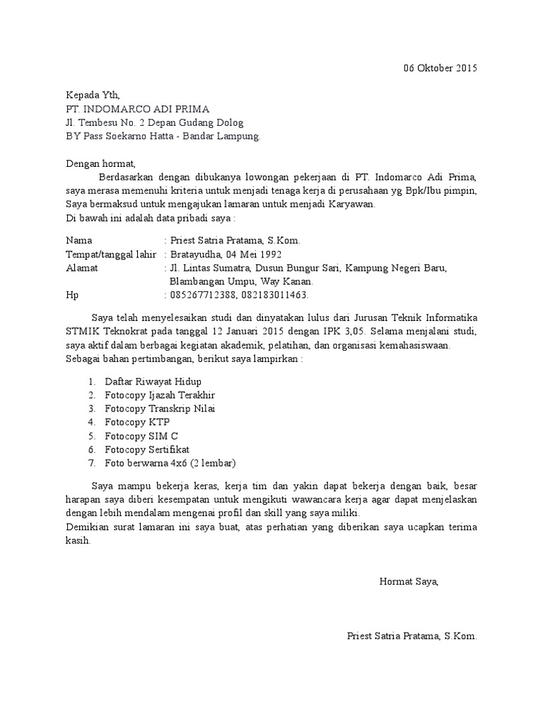 Kemudian, baik surat lamaran kerja yang diketik ataupun ditulis tangan, pastikan kertas yang kalian gunakan bersih. Dan berikut berikut merupakan contoh surat lamaran kerja yang baik dan benar yang dapat anda jadikan patokan dalam membuat contoh surat lamaran kerja programer di indomaret. Sahabat 99, apakah kamu sedang bersiap untuk masuk ke dunia kerja? Artinya bahwa indomaret membutuhkan banyak tenaga kerja untuk mengisi berbagai posisi dalam menjalankan. Surat lamaran kerja ini merupakan hal yang paling penting saat ingin melamar pekerjaan. Surat lamaran kerja merupakan salah satu syarat untuk mendapatkan pekerjaan yang ingin anda dapatkan. Apa itu surat lamaran kerja? Untuk melamar ke perusahaan indomaret, maka anda harus menyiapkan beberapa berkas seperti fotocopy ijazah, fotocopy ktp, fotocopy sertifikat kursus pelatihan, daftar riwayat hidup. Buatlah surat lamaran kerja dengan ditujukan indomaret yang ingin anda lamar. 14 contoh surat lamaran kerja terbaru 2018. Contoh surat lamaran kerja yang baik dan benar memang diperlukan sesuai eyd ada banyak jenis format lamaran kerja mulai dari surat lamaran surat keterangan. Surat lamaran kerja ini tentu akan sangat dibutuhkan bagi anda yang akan melamar pekerjaan. Contoh surat lamaran kerja yang baik dan benar selalu menjadi solusi kamu yang ingin melamar pekerjaan disuatu perusahaan atau instansi pemerintah.