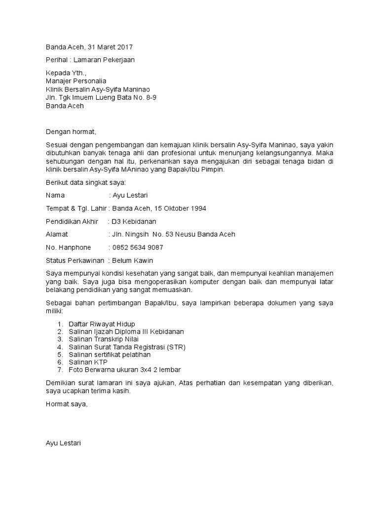 Contoh Surat Lamaran Kerja Bidan Di Rumah Sakit Pdf ... from imgv2-1-f.scribdassets.com Anda pun bisa terlebih dahul. Berikut contoh surat lamaran pekerjaan yang bisa kamu download file dokumennya juga, link di bagian akhir artikel. Selanjutnya kita di sini akan membahas tentang berbagai contoh surat lamaran kerja yang dapat dijadikan referensi dan contoh untuk melamar suatu pekerjaan. Contoh surat lamaran kerja yang baik dan benar kedua diatas, sangat berguna buat yang ingin melamar pekerjaan ke perusahaan perusahaan yang besar dan kompetitif, contoh bank mandiri dan bni yang mencari karyawan di bidang bidang yang profesional. Berbeda dengan lamaran pekerjaan di rumah sakit, khususnya mengisi lowongan di bidang kesehatan sebagai tenaga penggerak utama di rumah sakit, apabila anda berminat memasukkan surat lamaran untuk bekerja. Contoh surat lamaran pekerjaan untuk beberapa sumber informasi lowongan, diambil dari sumber di internet dan dilakukan modifikasi, semoga bermanfaatfull description. Contoh surat lamaran kerja untuk kerja di toko. Struktur dan bahasa surat lamaran kerja pada unit career development center (cdc) politeknik negeri lhokseumawe.